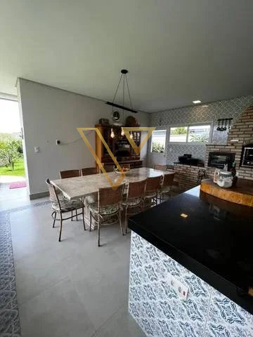 Área gourmet com churrasqueira, fogão a lenha, forno de pizza e uma mesa de mármore para 10 pessoas,